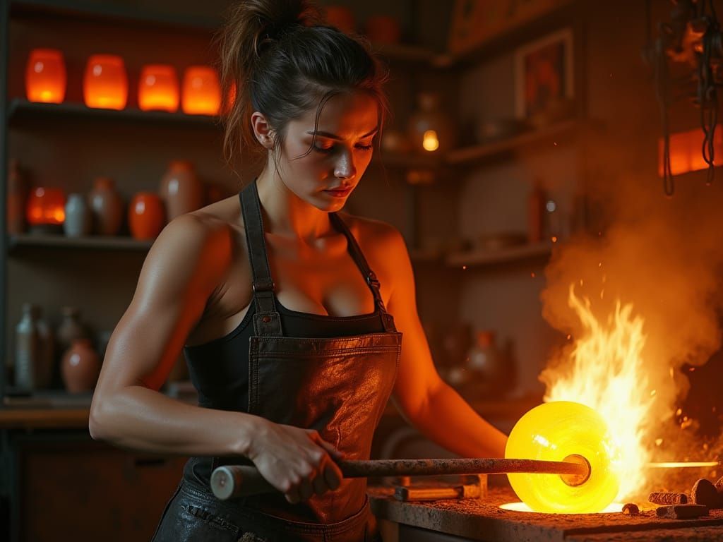 This image shows a strong female glass artist shaping molten glass. The workshop glows with orange light from the furnace, highlighting her focus and the beauty of her craft.