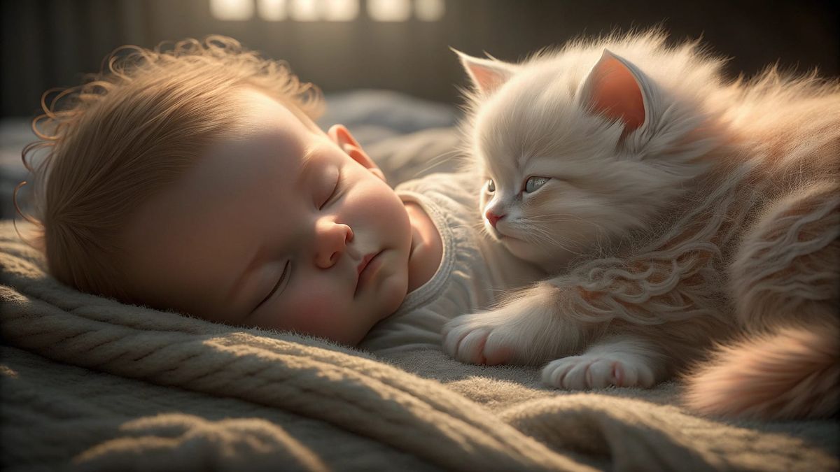 This image shows a fluffy kitten curled up beside a newborn baby, looking at the infant with gentle eyes. Rendered in highly detailed 3D game cinematic style with dynamic lighting.