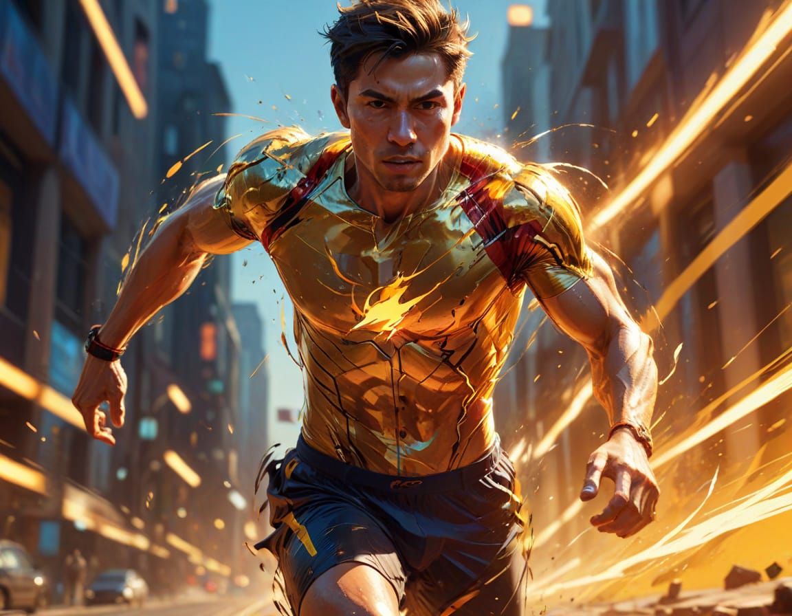 This image shows a person running at high speed. The concept art style features speed lines, blurred background, warm lighting and vivid colors to emphasize the fast-paced action.