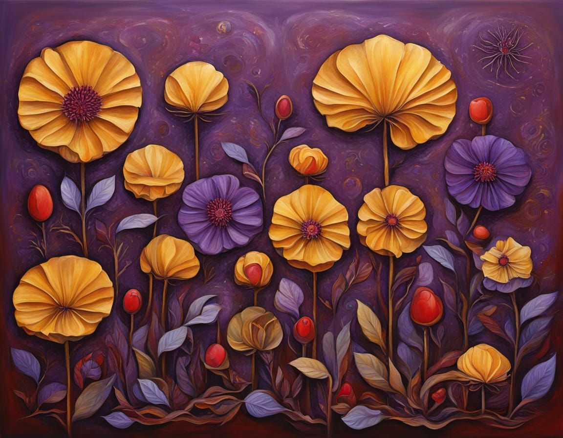 This striking abstract painting depicts a surreal Peruvian swamp scene with vibrant analogous colors and a naive folk art style. Features earthy tones accented by electric violet.