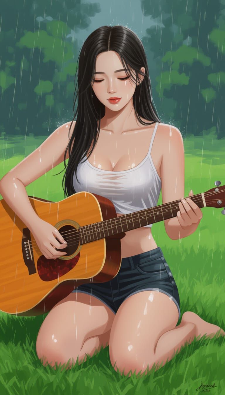 This image shows a young woman playing guitar in the rain. She is fair-skinned with long black hair, wearing a crop top and shorts. The scene is intimate, with a moody atmosphere.
