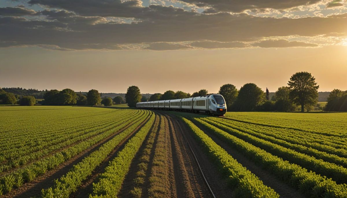 A realistic painting of a high-speed train moving through the French countryside. The artwork captures the warm light of the setting sun and deep shadows in a naturalistic style.