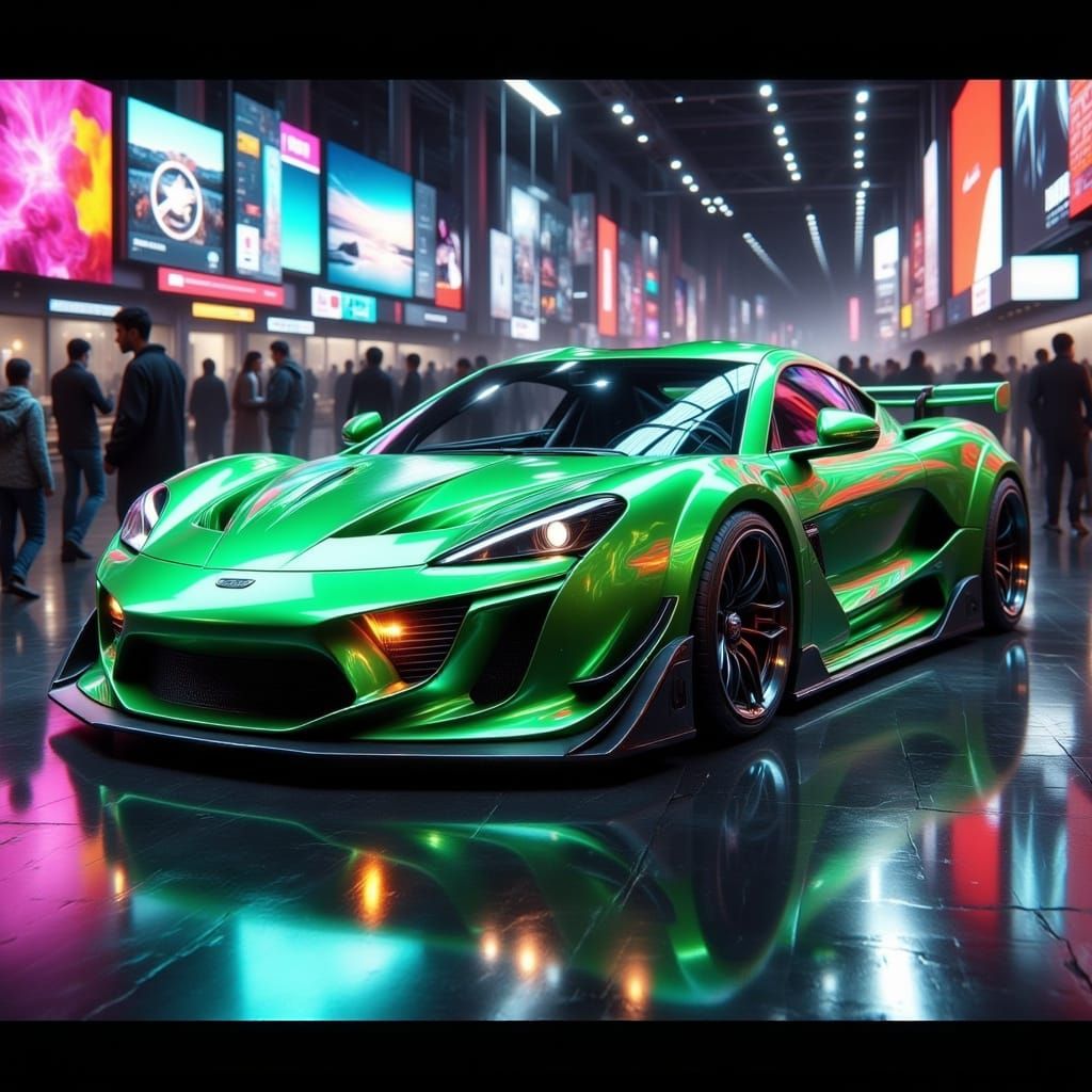 This image shows a futuristic sports car in a concept show. The car features a sleek, metallic green finish, custom rims and tinted windows, rendered with a vibrant, hyperreal aesthetic.