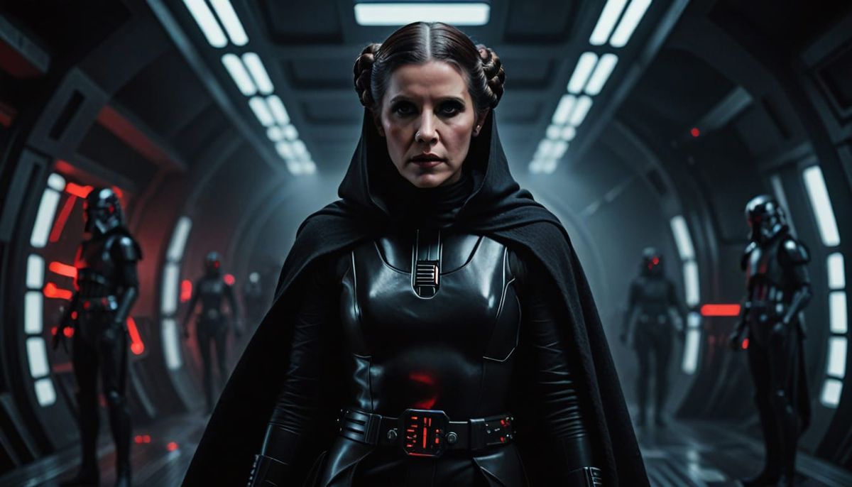 This image is a cinematic portrayal of a powerful female villain, standing on the command deck of her galactic slaveship, exuding an air of dark, ominous power and dominance, with a striking black leather armor and sheer black veil, evoking a sense of dark side intensity and galactic domination.