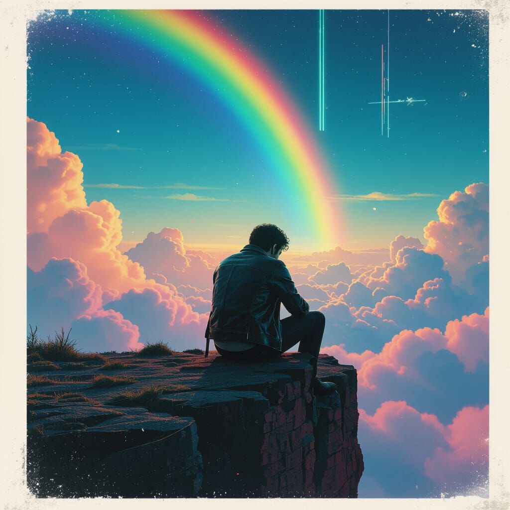 A cinematic image of a man in a leather jacket on a cliff above rainbow clouds, under a neon sky. Features dramatic lighting and film grain for a moody aesthetic.