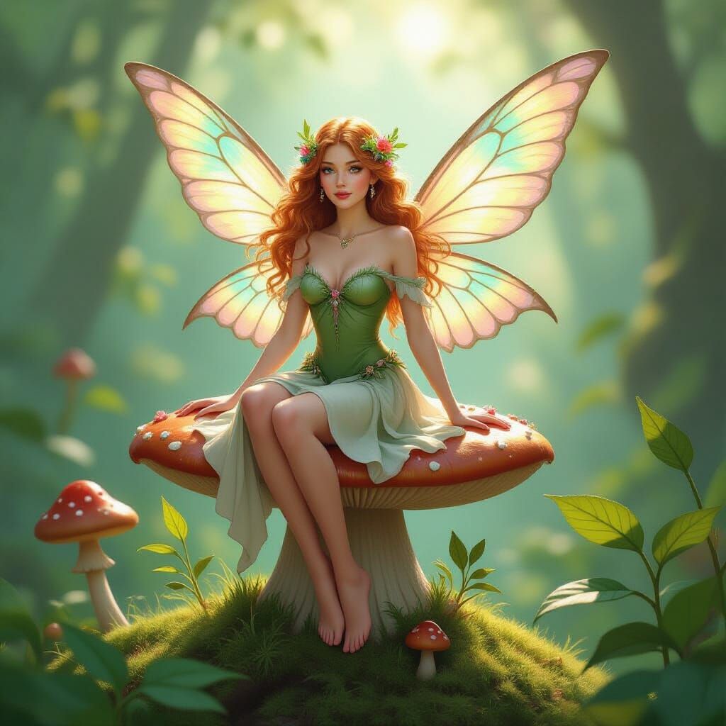 This image shows a delicate fairy with iridescent wings in a lush, green forest. The whimsical scene, reminiscent of classic fantasy art, is rendered with soft, ethereal lighting.