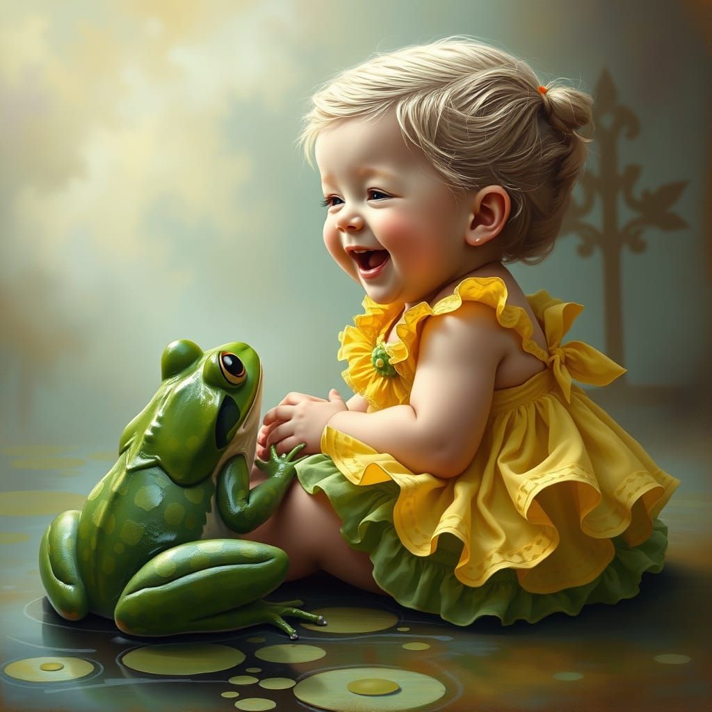 beautiful girl 2 years old chubby blonde with braids on her head, has a yellow and green ruffle dress, she is curled up on her knees, she laughs and in front of her on the floor a rather large green frog looking at her head up, realistic, oil painting