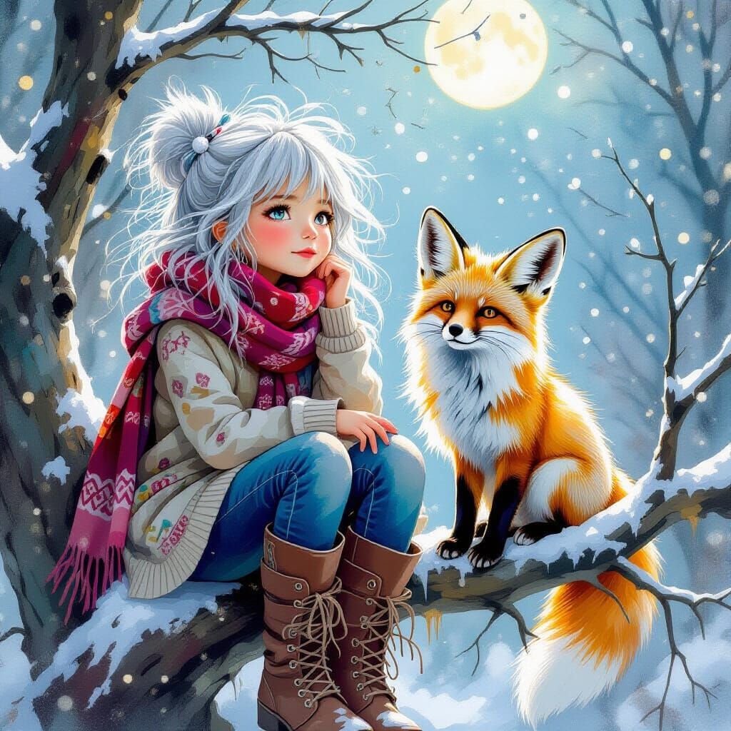 This image shows a detailed painting of a girl with messy silver hair and bohemian attire, sitting with a fennec fox on a tree branch in a whimsical Christmas scene, rendered with watercolor effects.