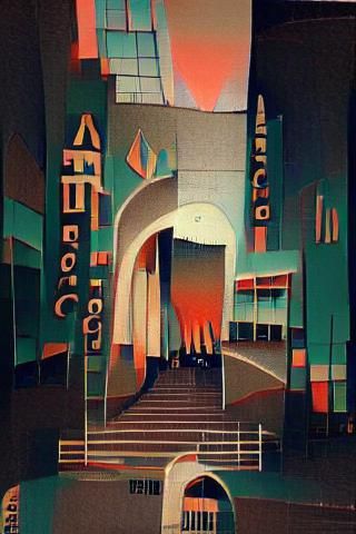 A space age art deco entrance to hell. The image showcases synthetism in a mid-century modern aesthetic, reminiscent of vintage art prints and posters.