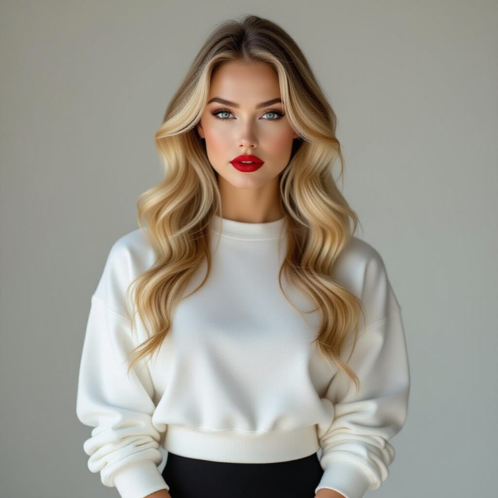A striking picture of a blonde ballerina en pointe, wearing ballet shoes, a silk sweatshirt, and leggings. This photorealistic portrait captures a commanding presence with bold makeup, reminiscent of high-fashion editorial photography.