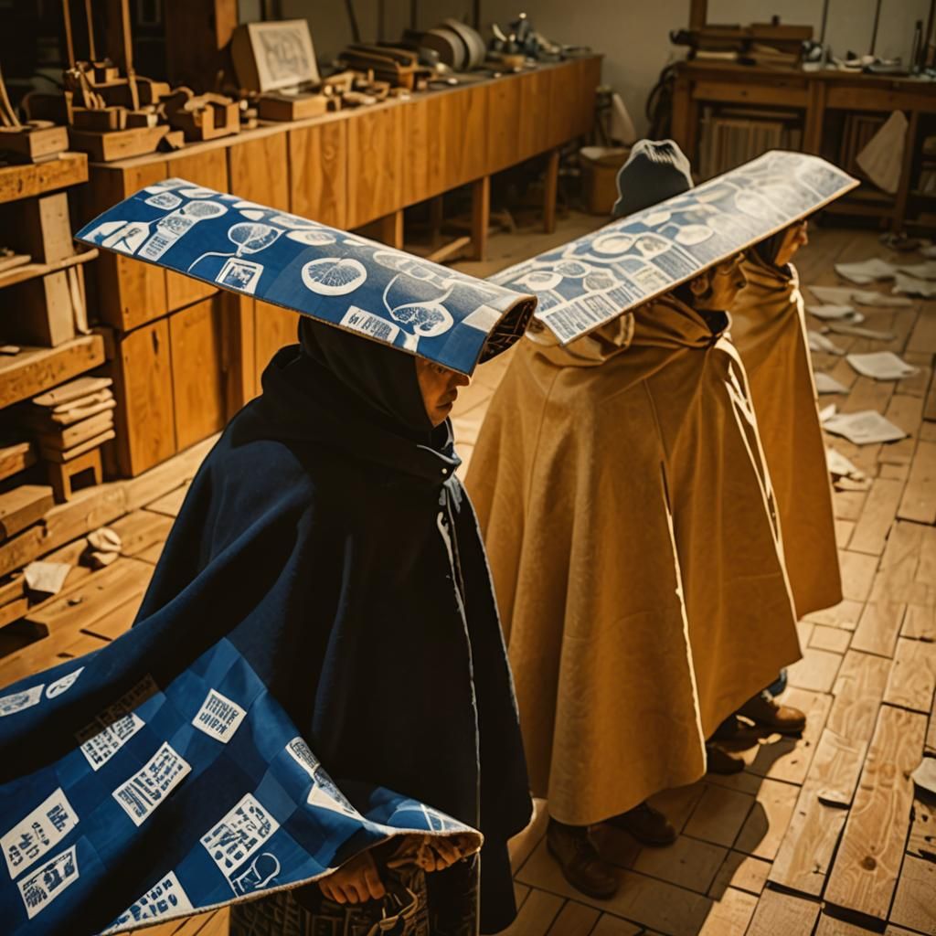 This image shows two activists harvesting mushrooms using large machines, set against blueprints and linocut fabric. The artwork features geometric abstraction, embossed textures, and a palette of earthy tones and azure, in a linocut style.