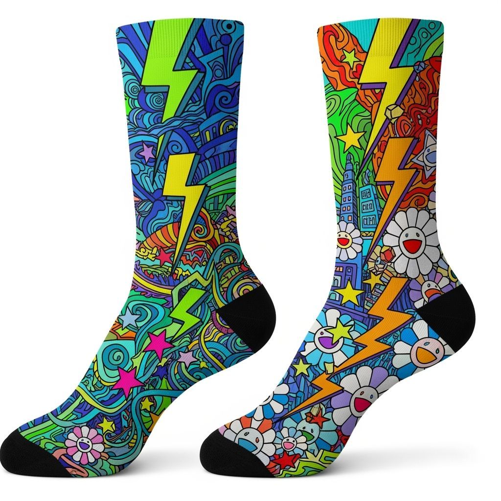 A vibrant illustration showcases superhero socks in a whimsical design. The artwork combines intricate linework, futuristic elements, and a superflat aesthetic with bold patterns and vivid colors.