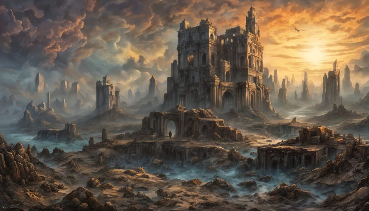 This image shows a glowing flower in a ruined city, with crystal formations under a dying sun. It's rendered in a hyperrealistic, ethereal fantasy style with mist and intricate details.