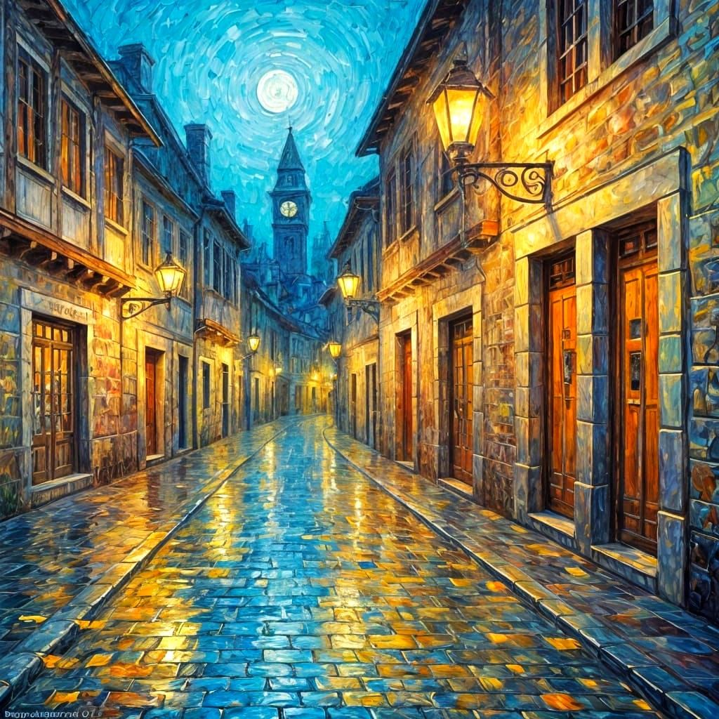 This image is an oil painting with thick, colourful textured paint layers, evoking a warm and inviting avenue in a neo-impressionist expressionist style.