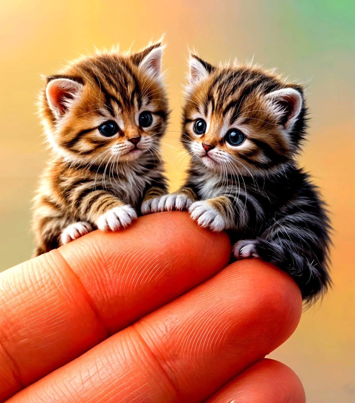 This image showcases hyperrealistic macro art of miniature kittens, no larger than a fingernail, sitting on fingertips. The detailed scene features fluffy kittens with big eyes, captured with side lighting and vibrant colors.