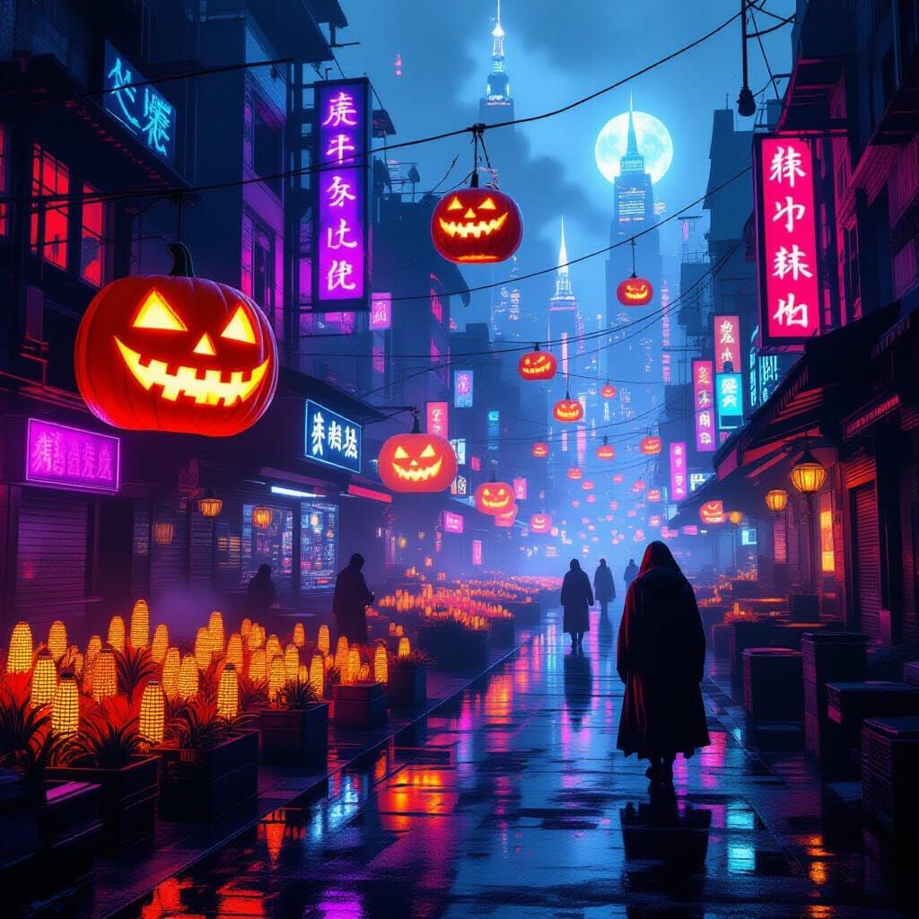 In a neon-lit megacity, digital pumpkins float in holographic markets while android farmers harvest glowing data-corn. Haunted AIs project spectral scarecrows into the misty alleys, blending festival and fear. The skyline pulses with orange and violet light, rain-soaked and glitch-saturated, inspired by Blade Runner and retrofuturist cyber-horror aesthetics.