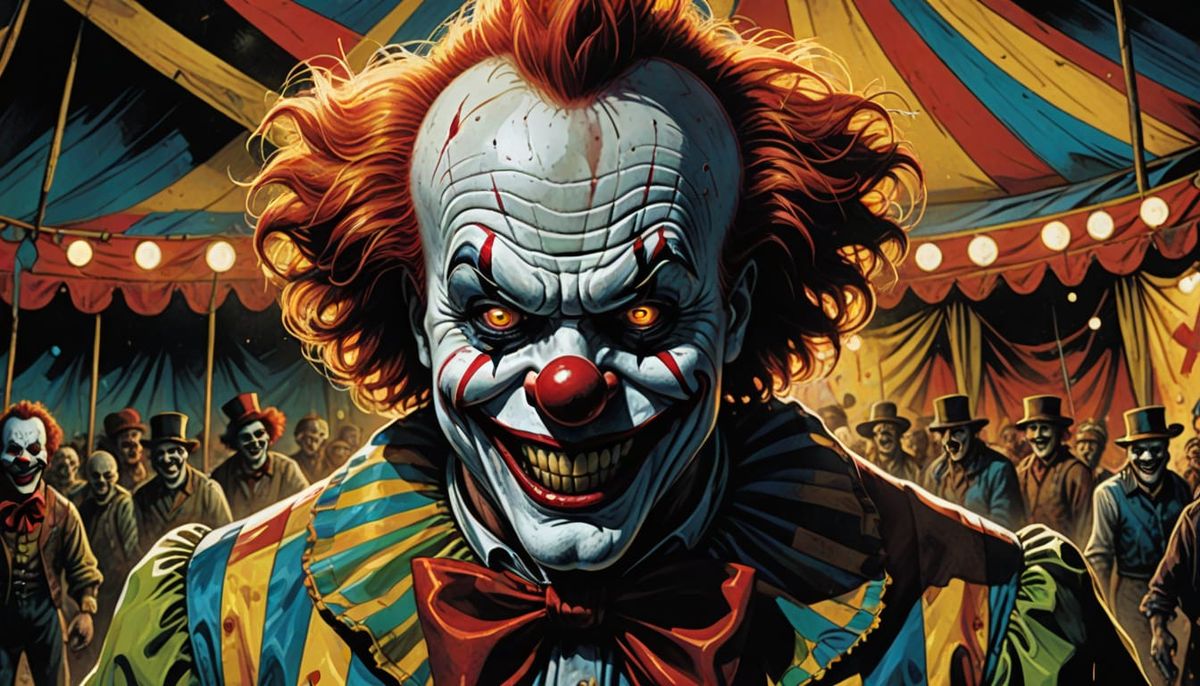 This image shows a menacing horror clown in an abandoned circus tent, rendered in a comic book illustration style. The artwork features brightly colored stripes and low-key lighting.