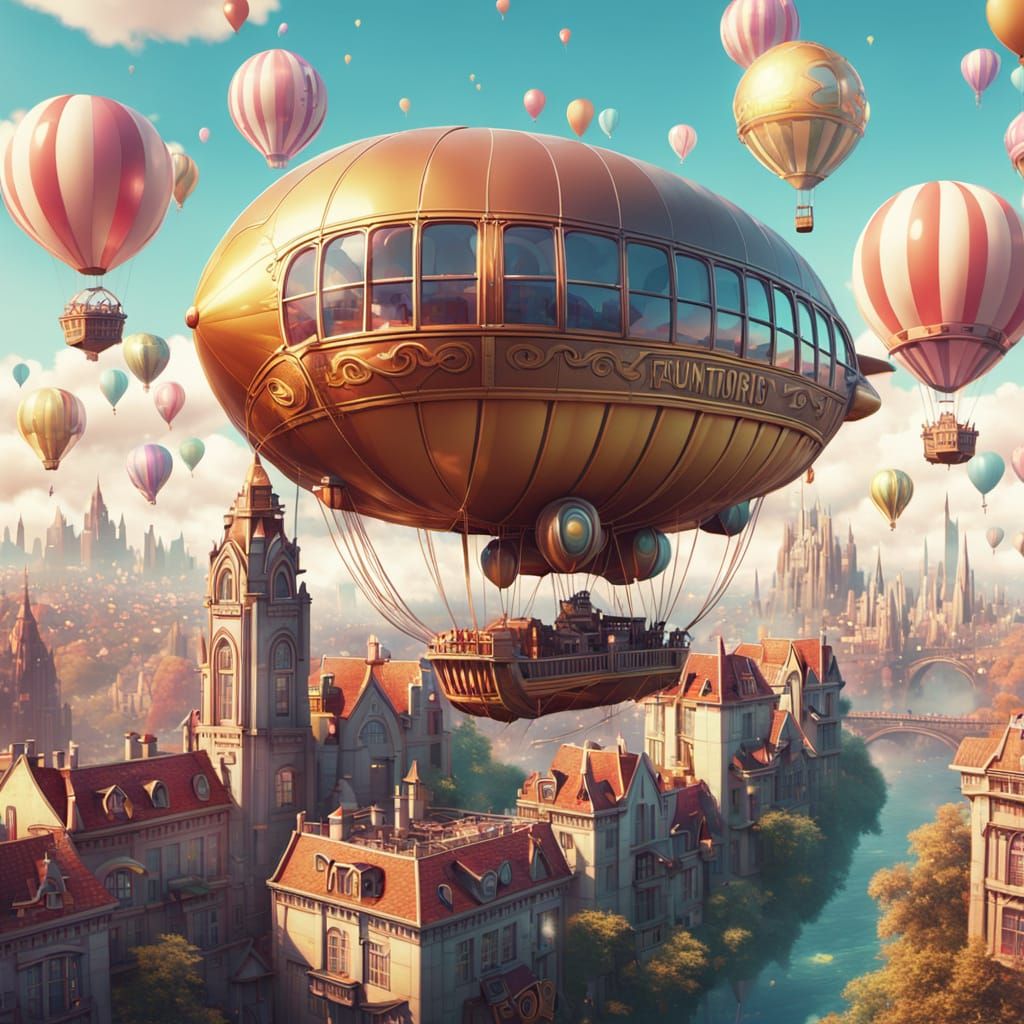 This image shows a retro-futuristic airship floating above a fantasy city. The airship, designed as a vintage advertisement for a cotton candy shop, features candy-filled windows and golden lighting in pastel colors.