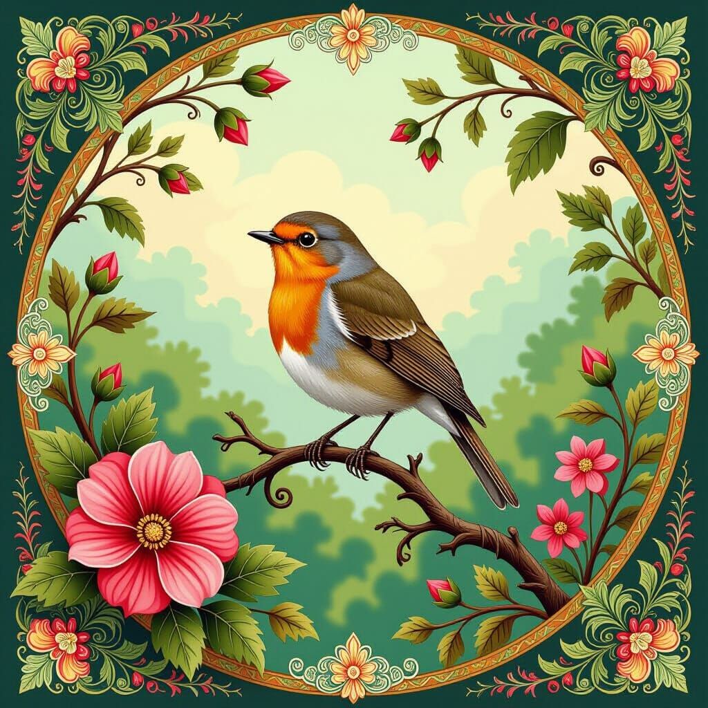 A vibrant image of a robin amidst lush foliage and flowers, rendered with warm colors and intricate details. The artwork evokes folk art primitivism and storybook charm, reminiscent of retro earth art.