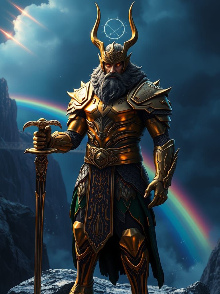 This hyperrealistic image shows Heimdall, Asgard's guardian, on the Bifröst. He wears shining golden armor, holds Hofund, and has glowing cosmic eyes, with the Rainbow Bridge behind him.