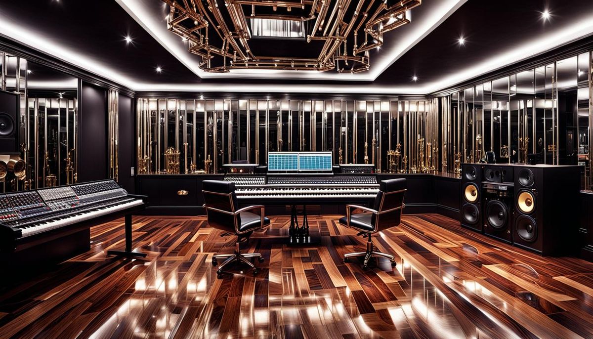 We see a Music Recording studio, glitzy, stunning expensive, stunning wood floor, mirrored finishes metallic and amazing mood lighting.