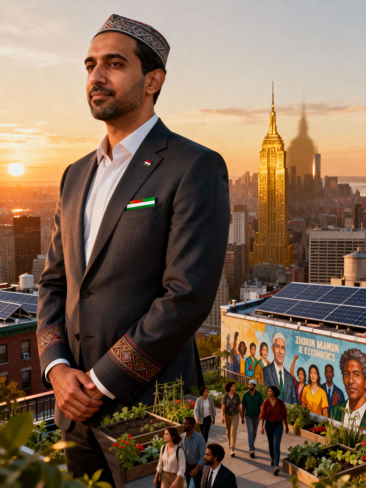A photorealistic digital artwork of NYC Mayor Zohran Mamdani against the Manhattan skyline at sunrise. The scene radiates optimism, showing a hopeful vision of equality and solidarity in the city.