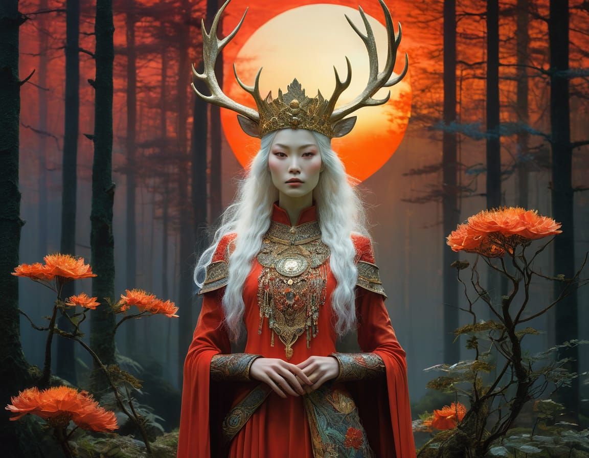 This captivating image features a mystical elven princess, set amidst a vibrant red sunset in a forest glade. She stands confidently, adorned with a crown of flowers and wearing a flowing sundress, as she gazes out with a bold expression. The scene is characterized by rich, dynamic colors and a blend of ...