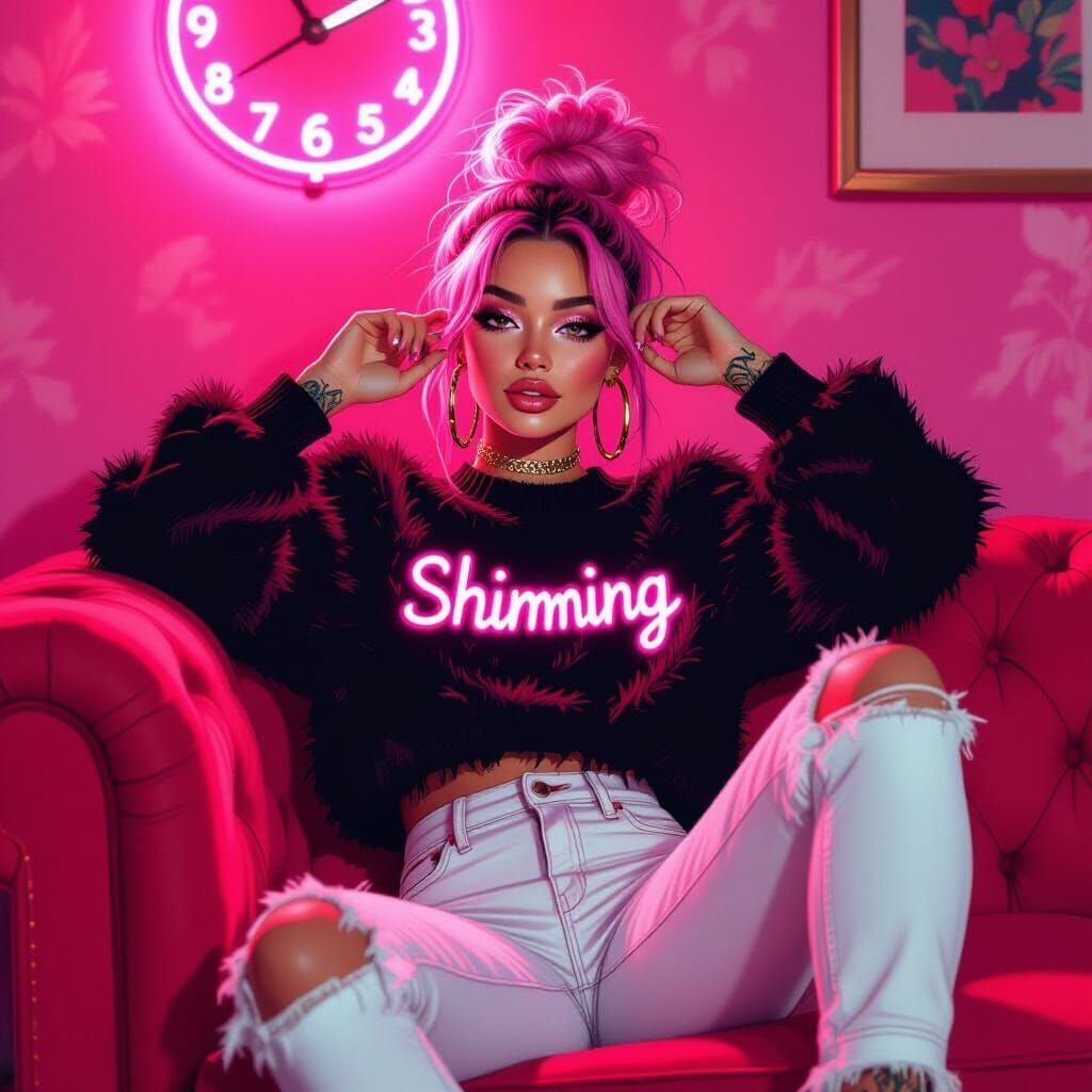 A vibrant image of a woman with pink hair relaxing on a red sofa. The digital artwork features bold brushstrokes and vivid colors, with a messy bun, tattoos, hoop earrings, and neon accents.