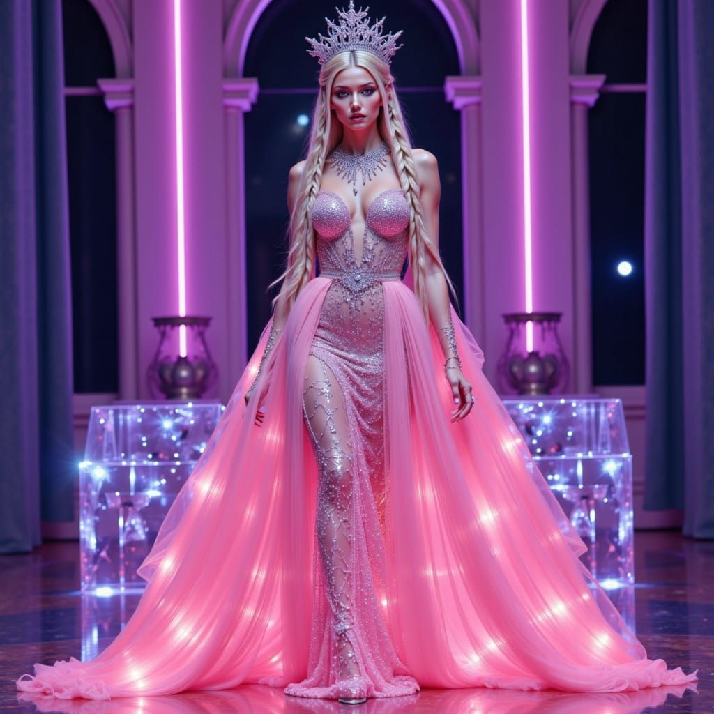 This image shows a beautiful tsaritsa with long blonde hair and violet eyes, wearing a pink gown and kokoshnik, standing on a glowing cube. The artwork is reminiscent of Marc Chagall with volumetric lighting and warm colors.
