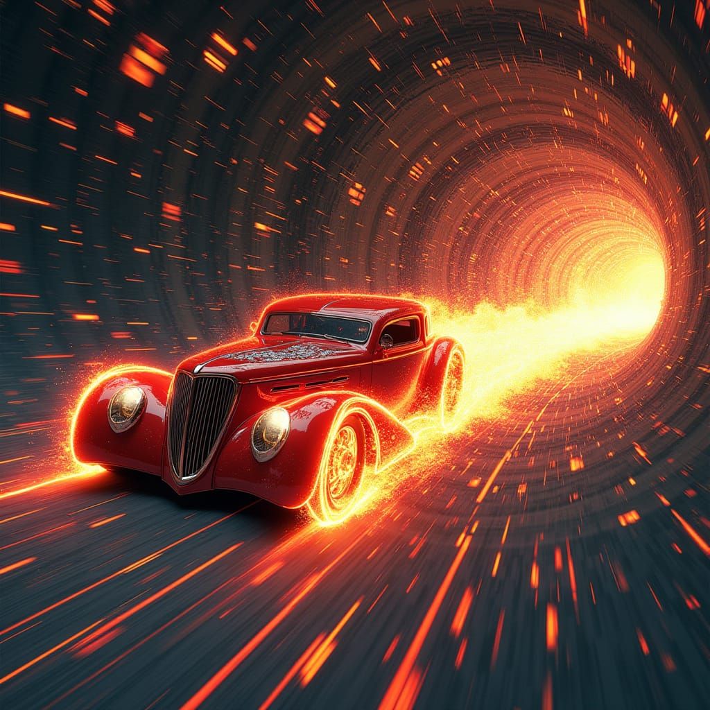 This image shows a red hot rod engulfed in golden flames racing through a time tunnel. The scene blends neon futurism and glitch art in a chaotic, atmospheric style.
