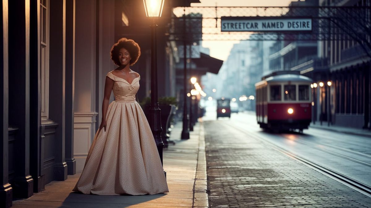A vintage photograph captures Blanche DuBois on a Southern street. An old streetcar disappears in the distance, under a sign reading "Streetcar Named Desire". The image evokes nostalgia with soft, golden hues.