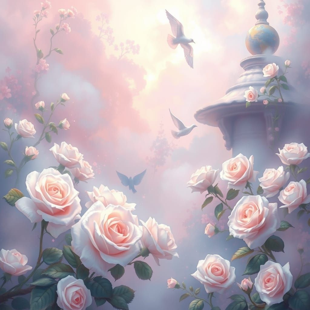 This serene image features delicate white roses set amidst a soft rose and blue hue backdrop, with ethereal mist and intricate details, evoking a warm and inviting atmosphere reminiscent of classic fantasy art