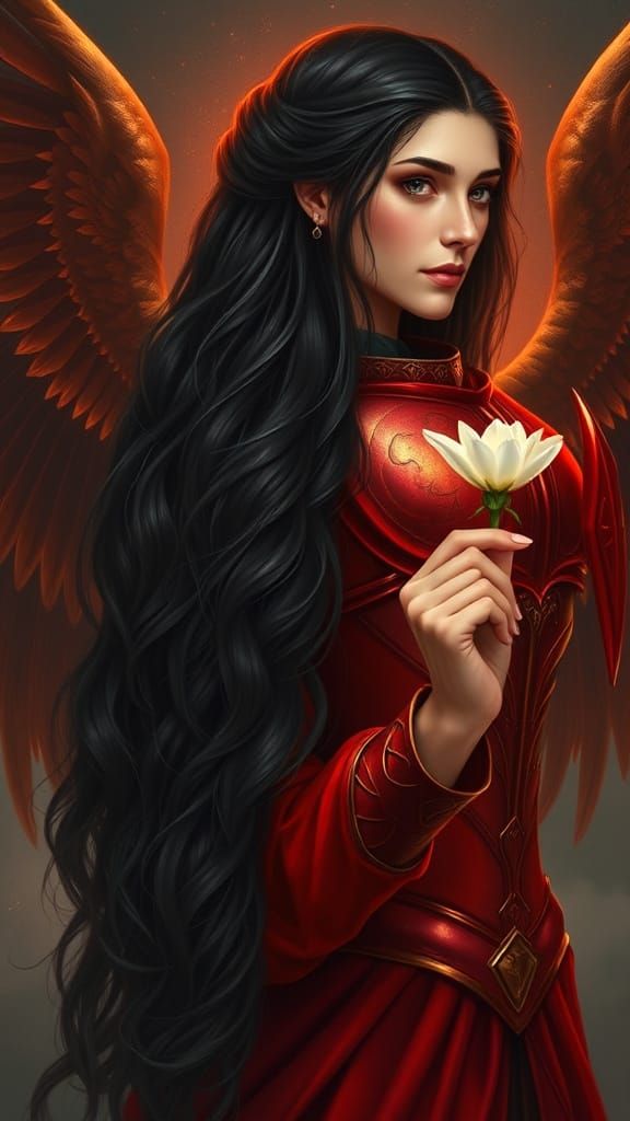 This image depicts a serene and compassionate goddess, Eir, a valkyrie with long black hair, wearing red armor and holding a white flower, symbolizing hope and healing.