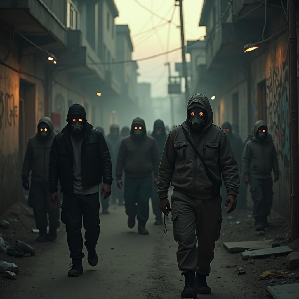 This image shows a crowded urban alleyway filled with trash, graffiti and worried people wearing masks. The scene is set at dusk with cinematic lighting in a gritty, dystopian style.