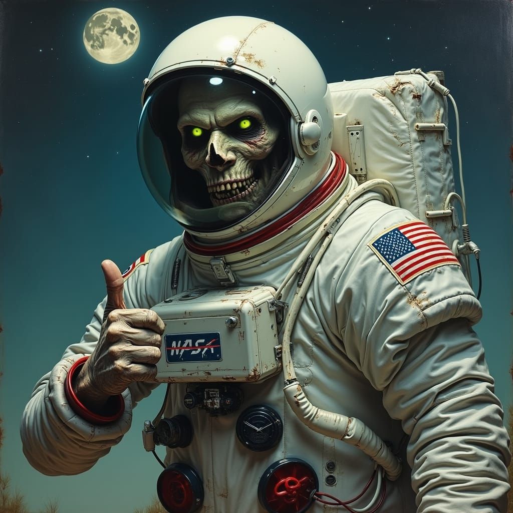 This haunting oil painting depicts a zombie astronaut in space, clad in a tattered spacesuit, with an unsettling glow emanating from his green eyes. Rich textures and visible brushstrokes evoke a sense of foreboding, blending classical techniques with sci-fi horror elements.