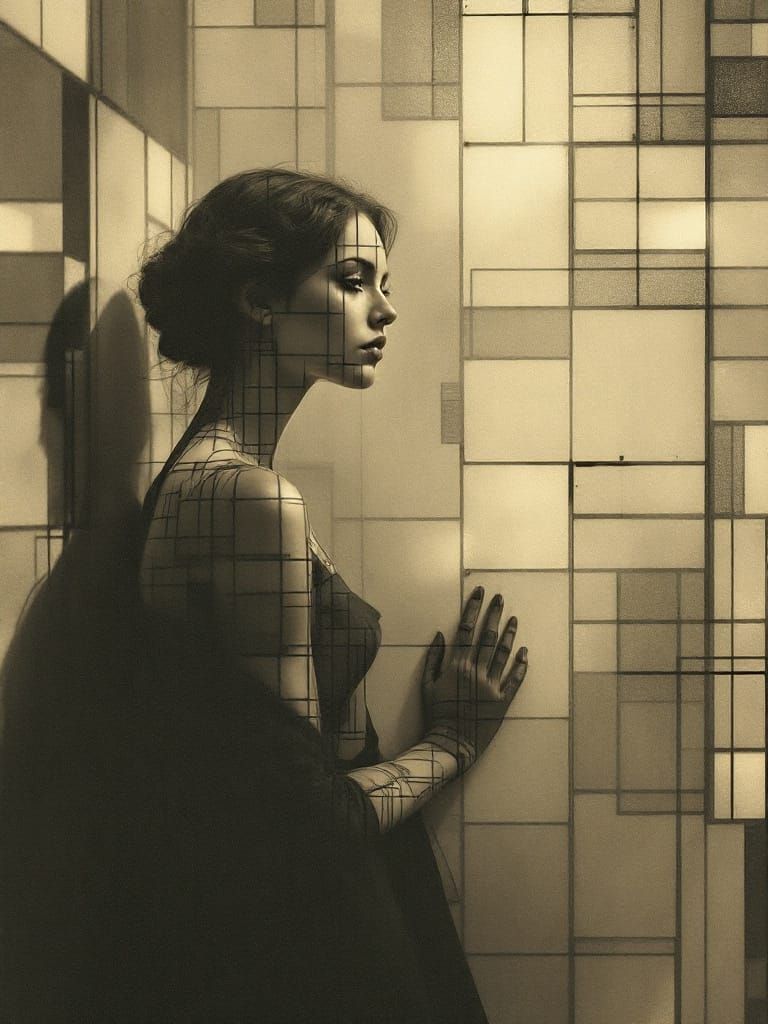 This image showcases a woman's profile seamlessly integrated with a geometric wall design. It features a muted sepia-amber palette, soft-edged forms, and concentrated light for a contemplative, mysterious glow.