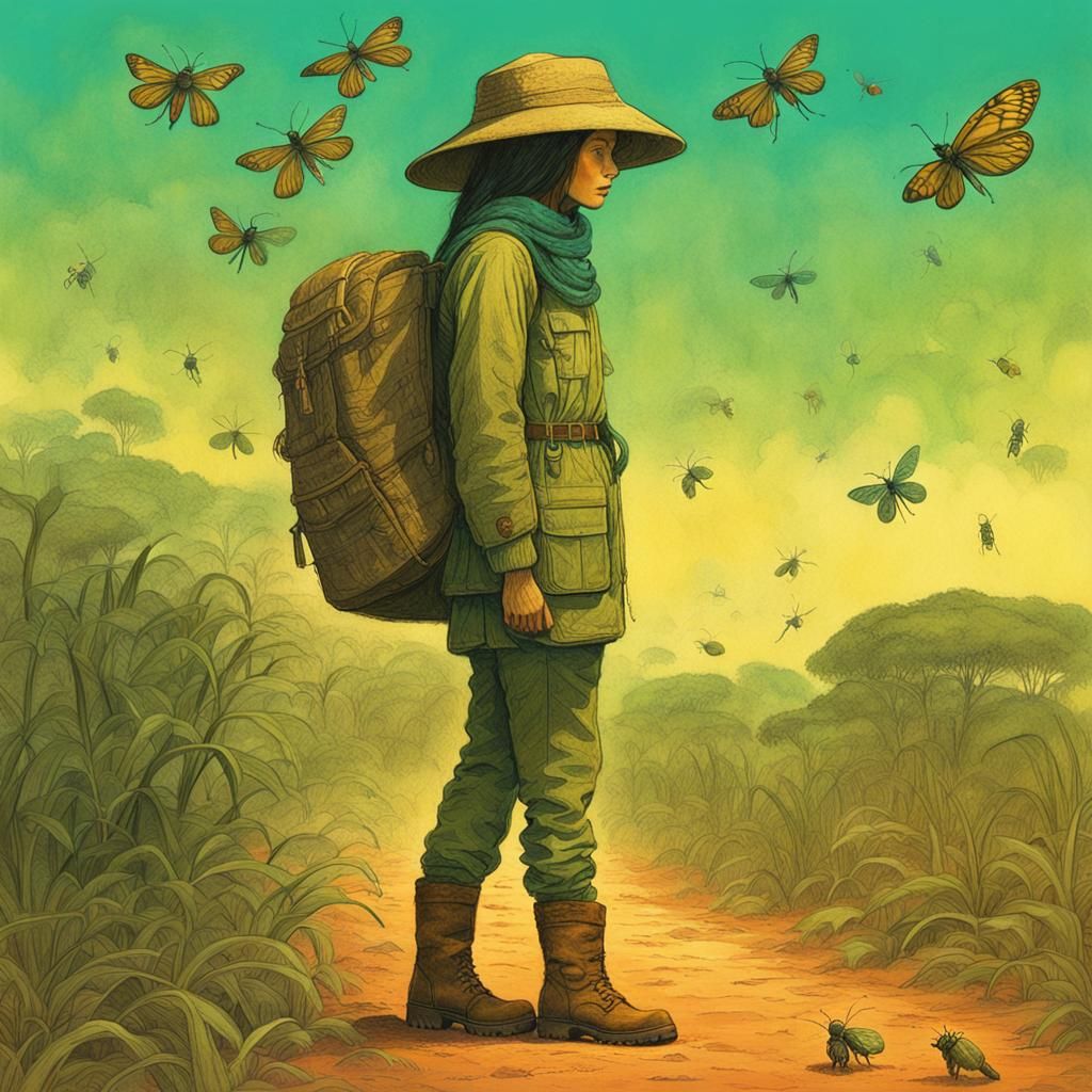 This image shows a woman in safari attire surrounded by insects. The artwork evokes a storybook illustration style with spacecore elements, reminiscent of Beksiński's surreal and nightmarish art.