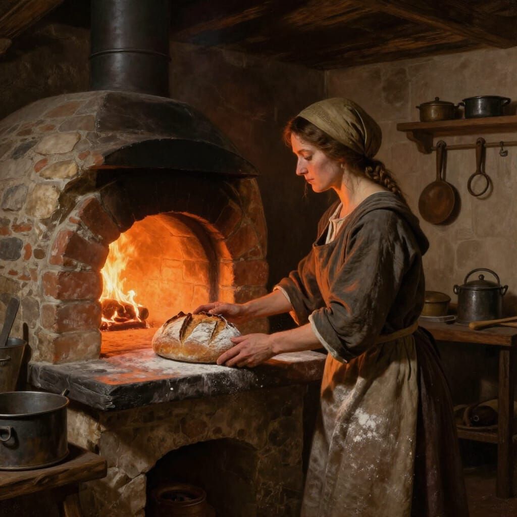 This image shows a medieval woman baking sourdough bread in a rustic kitchen. Rendered in a realistic oil painting style with dramatic chiaroscuro lighting, it captures the warm glow of a brick oven.