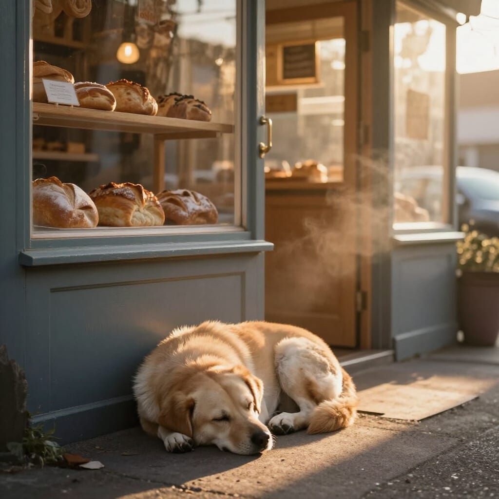 This image shows a dog sleeping peacefully outside a bakery in the soft morning light. Warm glow from inside hints at fresh bread, creating a comforting and calm scene.