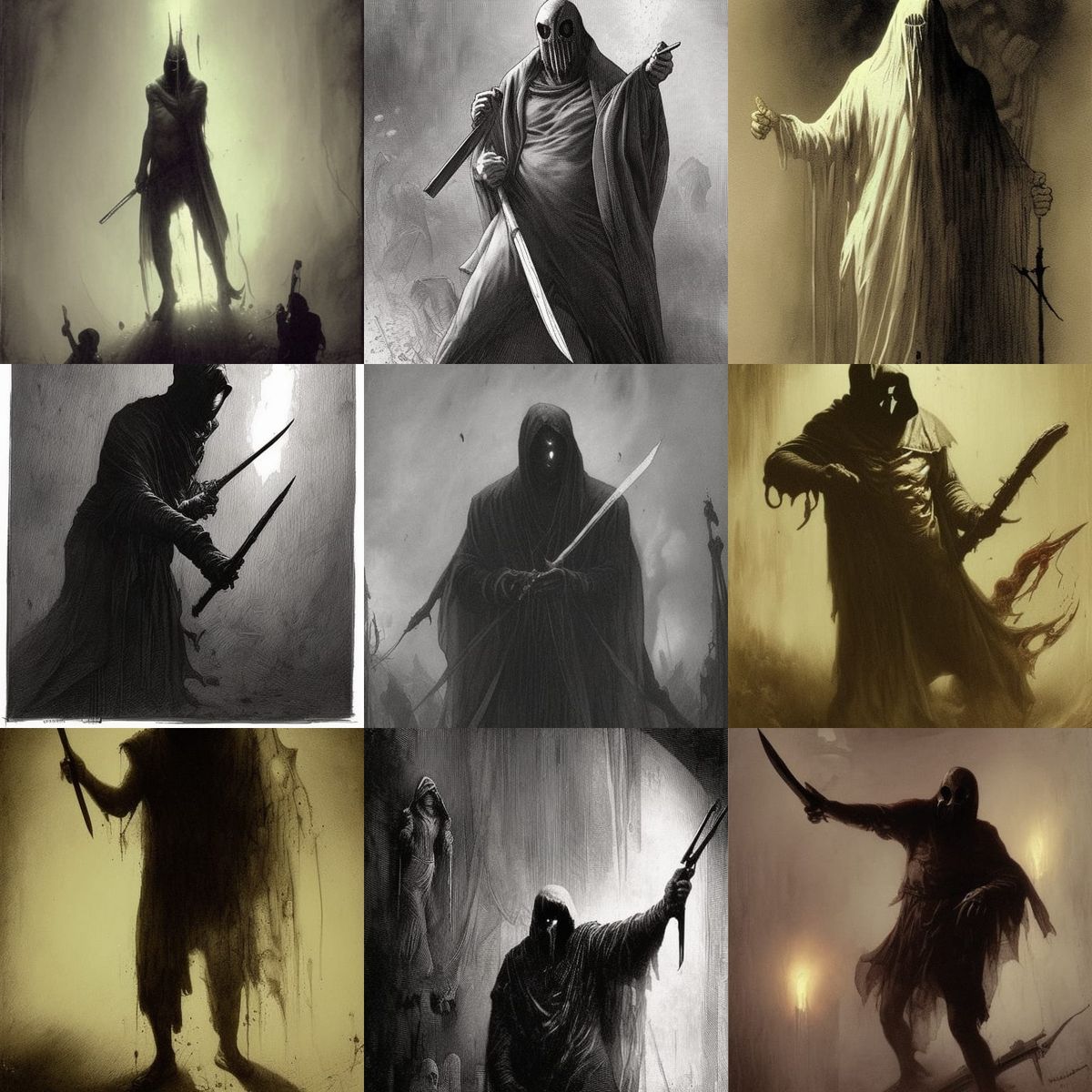 This image depicts a menacing figure staring directly at the viewer, brandishing a weapon. The artwork evokes a dark, gothic horror style reminiscent of classic engravings.