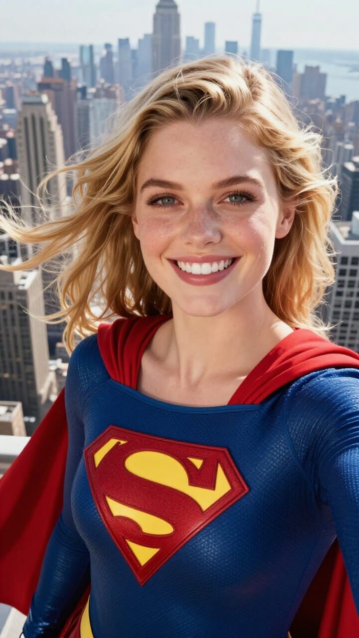 A photorealistic selfie of Supergirl smiling with her blond pigtails flowing, wearing her classic suit and red cape against a sunlit Manhattan skyline. Captures pure joy and freedom.