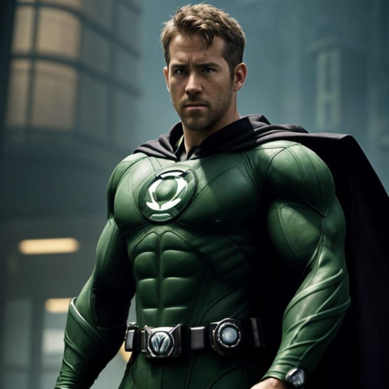 A cinematic film still of Ryan Reynolds as the Green Lantern, shot in high definition with a vintage aesthetic and rich film grain, evoking a sense of drama and epic storytelling.