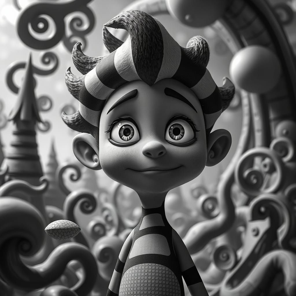 This image shows a fantastical scene with a semi-realistic cartoon character, blending realistic textures with stylized environments, featuring bold stripes and high-contrast facial expressions, reminiscent of 3D Pixar characters in a dreamlike setting.