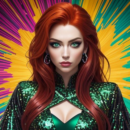A vibrant image showcasing a young woman with auburn hair and emerald eyes, posing confidently in a sequined jumpsuit. The artwork features bold colors and swirling patterns in a camp aesthetic.