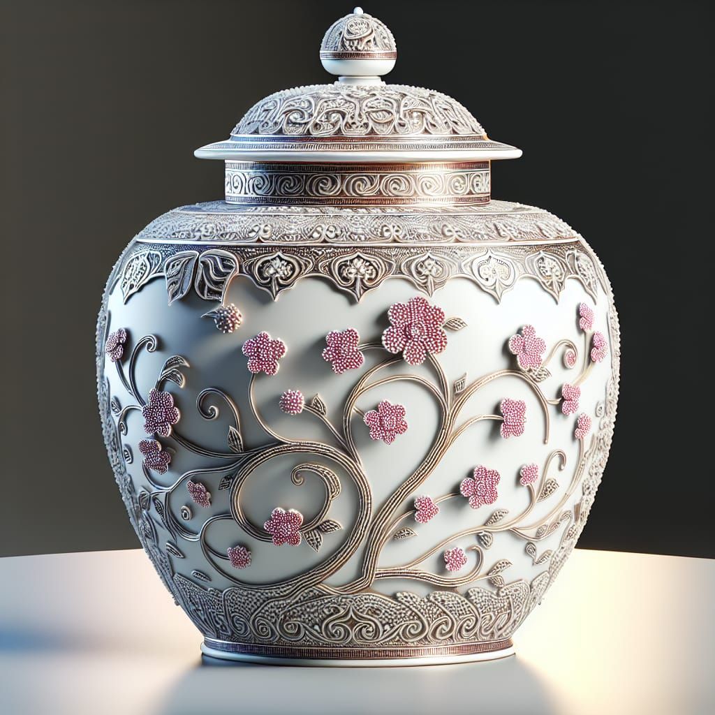 A 3D visualisation of an extremely ornate ginger jar with a lid. The jar showcases the style of cloisonné, a method known for its intricate and delicate decorations. Adorning the jar are filigree designs of small pink flower vines, set against the stark contrast of a white background. This beautifully ...