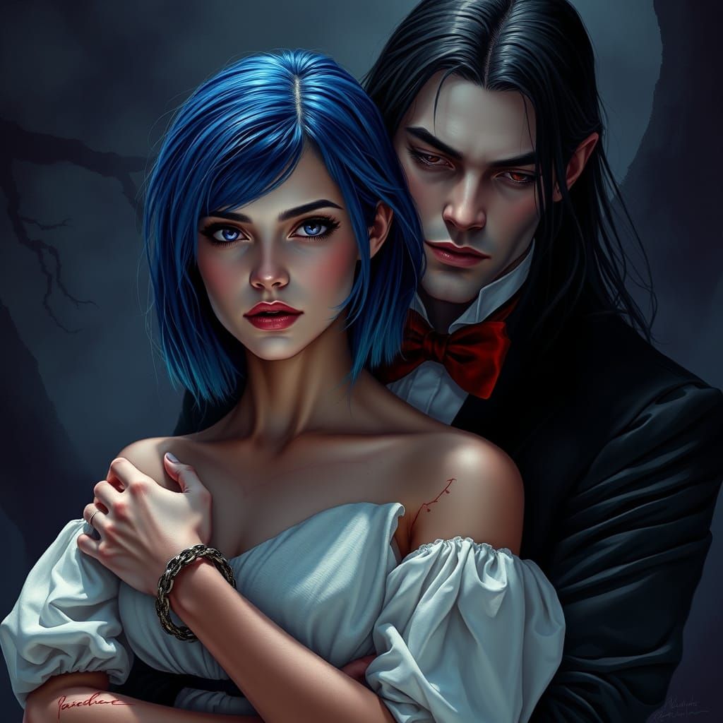 This image captures a haunting scene of a young woman with electric blue hair and violet eyes, held by a mysterious vampire with red eyes, in a dark, atmospheric setting reminiscent of 19th-century Gothic novels and eerie illustrations.
