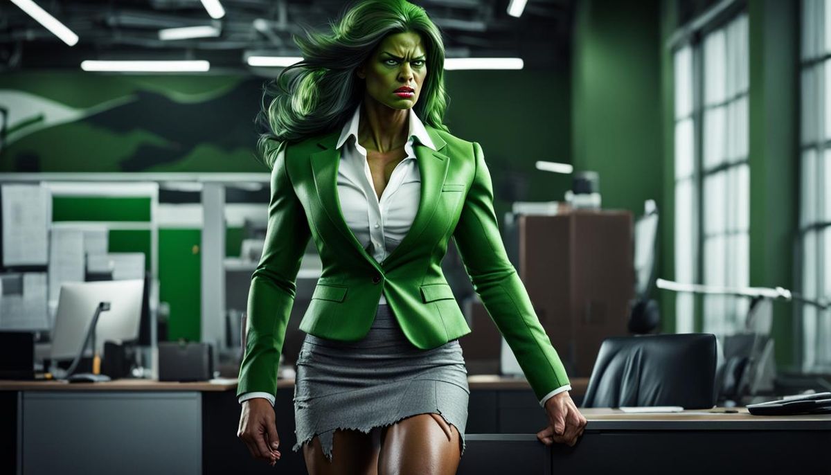 This image shows an angry She-Hulk in an office setting. She has green skin, is dressed in torn business attire, and has large muscles tearing through her clothes in photorealistic detail.