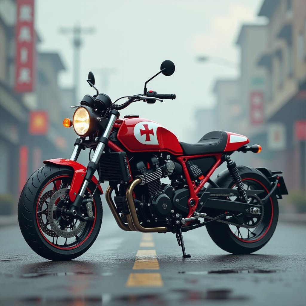 A striking picture of a vibrant red and white chopper bike featuring the Cross of Saint George. The image blends futuristic vehicle design with dystopian landscape elements in a digital painting style.