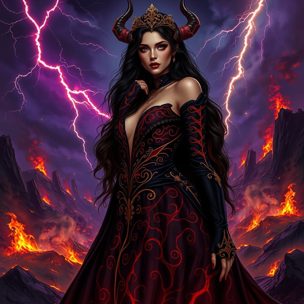 This image depicts a hauntingly beautiful, high-fashion illustration of the Hell Lady of Apocalypse, surrounded by apocalyptic chaos and dressed in a stunning, dark vintage gown with intricate, golden demonic script and pulsating crimson veins, set against a backdrop of lightning and burning ruins.