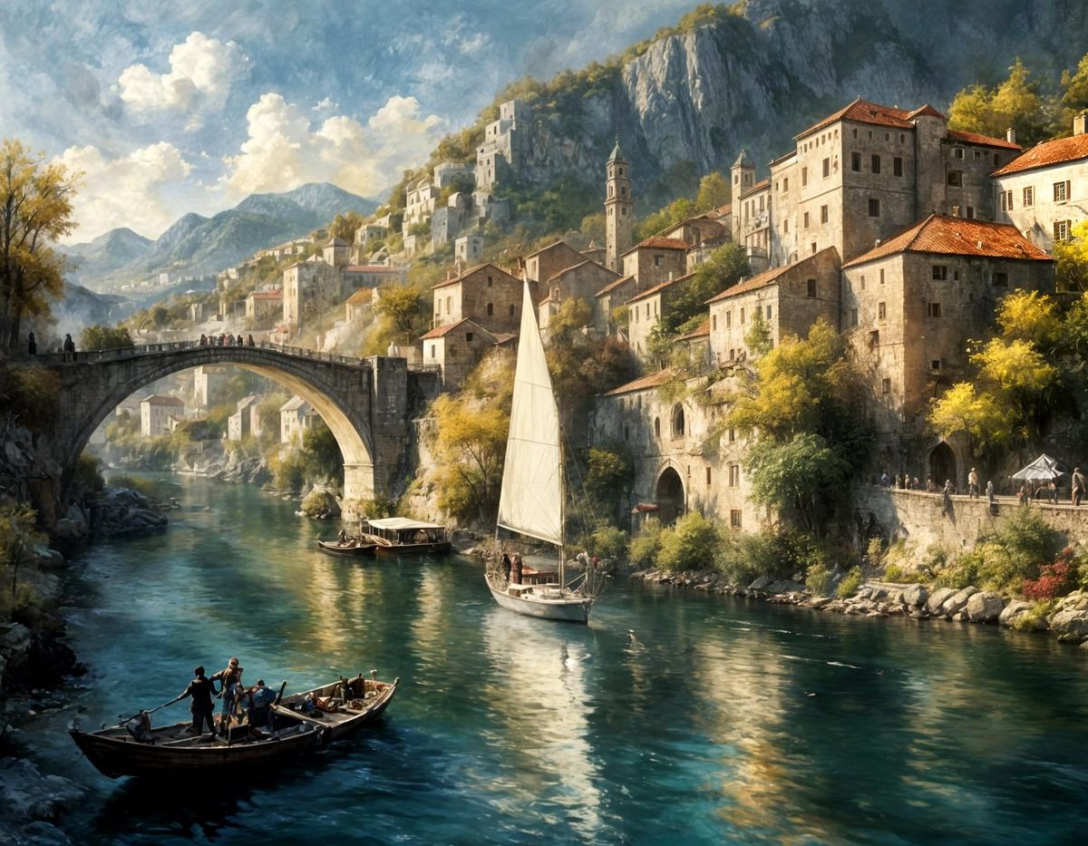 😍W❣️O❣️W😍Awesome!!!❤️👍🤩👍 A timeless river town nestles between cliffs and sky, where a stone bridge arches over glistening waters and life flows like a gentle melody — history painted in light, stone, and soul 🌉🌊🏞️✨🎨🔥💫🌀🌌